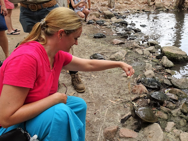 Schildkröten mit stinkendem Fisch füttern. Sie haben nicht so eine gute Koordination und schnappen oft daneben.